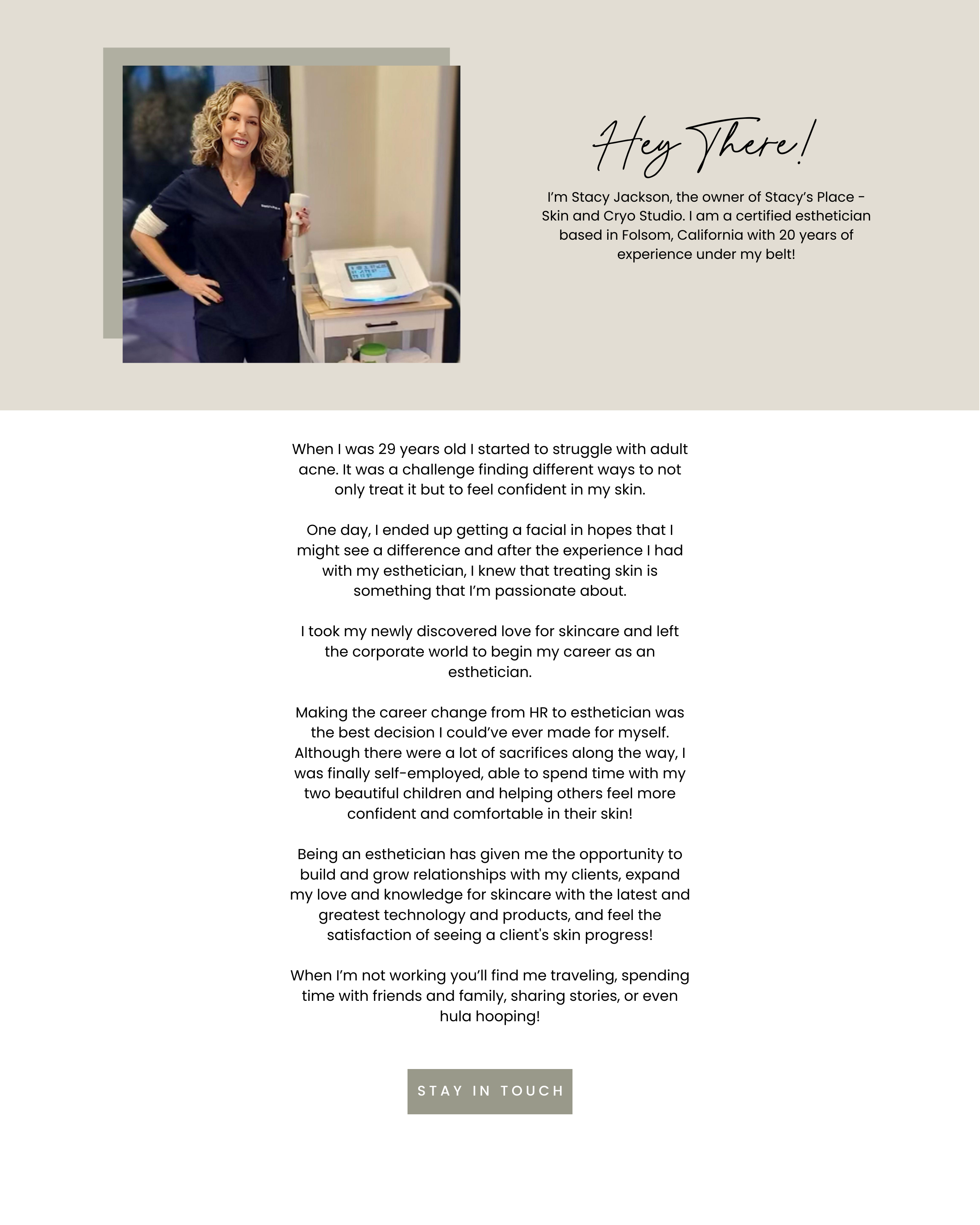 “I have been a client of Stacy for almost 2 years now. I love how my skin feels and looks after 3 sessions of cryofacial. I only trust her for my skin needs!”